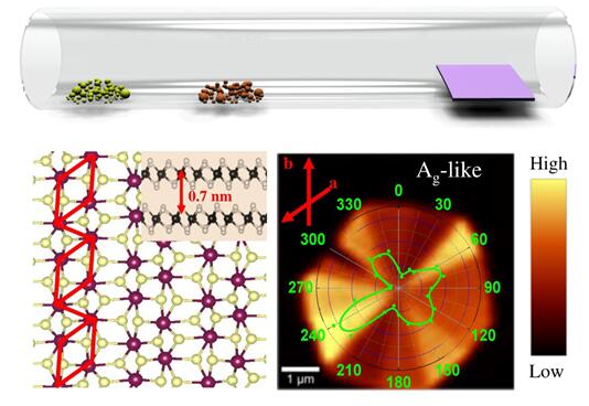 不同于絕大多數已被廣泛研究的其他TMDs二維材料如二硫化鉬(MoS2),二硒化鎢(WSe2)等,ReSe2除具備常規的光電性能外,還具有各向異性的特性。簡單的說,如果沿著六角形ReSe2的不同方向進行測量,那么我們就可以得到有顯著差異的性能數據。這種新穎的性質來源于ReSe2內部特殊的原子結構。在二維ReSe2原子晶體結構中,存在著一條牢固的Re4“鉆石狀”鏈,正是由于這樣一條鏈的存在使得偏離這條鏈取向的各項性能都有顯著地差異,即各向異性。來自華中科技大學材料系的翟天佑課題組還首次通過偏振拉曼光譜對ReSe2六角形晶體的各向異性特征進行了直觀而又詳盡的展示,并在此基礎上構筑了高性能二維光探測器。