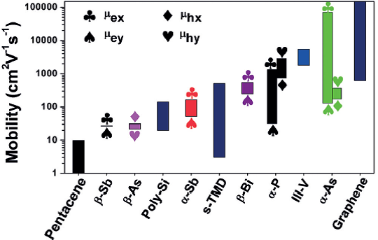 2015年,以塊體灰砷與灰銻為母體材料,南京理工大學(xué)曾海波團(tuán)隊(duì)設(shè)計(jì)了二維砷烯與銻烯熱動(dòng)力學(xué)最穩(wěn)定的原子結(jié)構(gòu),并預(yù)測(cè)了其半導(dǎo)體性電子結(jié)構(gòu)(Angew. Chem. In. Ed. 2015, 54, 3112)。但是除了維度縮減誘導(dǎo)的半金屬-半導(dǎo)體轉(zhuǎn)變以外,它們的價(jià)帶頂、導(dǎo)帶底、遷移率等對(duì)將來的器件設(shè)計(jì)非常關(guān)鍵。最近,該團(tuán)隊(duì)系統(tǒng)地探索了第五主族單原子二維材料的以上關(guān)鍵特征,包括磷烯、砷烯、銻烯、鉍烯等(Angew. Chem. Int. Ed. 2016, 55, 1666)。結(jié)果表明它們的帶隙能量涵蓋0.36至2.62 eV,對(duì)應(yīng)于從紅外到可見的寬光譜響應(yīng)。價(jià)帶頂分布于-4.66到-3.05 eV之間,導(dǎo)帶底分布于-3.08到-1.22 eV之間。令人興奮的是,結(jié)果表明它們會(huì)具有較高的遷移率,尤其是α相砷烯,高達(dá)105 cm2V-1s-1,與石墨烯相當(dāng),高于目前電子器件經(jīng)典材料硅,也高于經(jīng)典光電子材料三五族半導(dǎo)體。低維材料在線長(zhǎng)期提供這一類優(yōu)秀的高性能材料,這些結(jié)果為第五主族單原子二維材料的電子與光電子器件設(shè)計(jì)提供了關(guān)鍵參數(shù)。