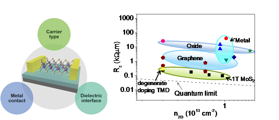 在金屬接觸上,有表面接觸(top-contact)和邊緣接觸(edge-contact)這兩種接觸結構。邊緣接觸結構中,二維材料和金屬可以形成強的化學鍵,所以接觸電阻較小。形成邊緣式接觸的一個巧妙辦法是把半導體性二硫化鉬(2H相)轉化成金屬性(1T相),用1T相部分作為接觸區域實現歐姆接觸。這一開創性工作給二維半導體器件的未來發展提供了很好的策略。最近報道的以重摻雜過渡金屬硫屬化物作為接觸材料的二維晶體管,同樣實現了極低的接觸電阻。摻雜技術的進步有利于形成金屬與二維材料的歐姆接觸。