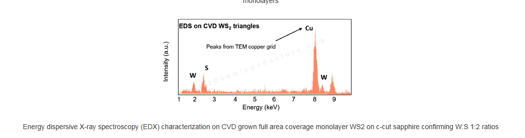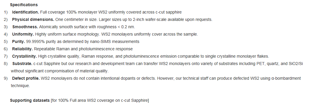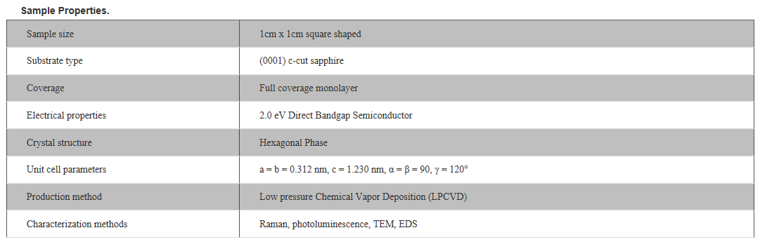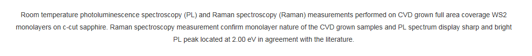 This product contains full area coverage WS2 monolayers on c-cut sapphire substrates. Sample size measures 1cm in size and the entire sample surface contains monolayer thick WS2 sheet. Synthesized full area coverage monolayer WS2 is highly luminescent and Raman spectroscopy studies also confirm the monolayer thickness.
