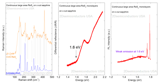 Raman spectroscopy measurement confirm monolayer nature of the CVD grown samples. Differential reflectance measurements clearly show band gap at 1.6 eV for ReS2 consistent with the existing literature values. PL spectrum only display weak emission at 1.6 eV but significantly stronger at lower temperatures.