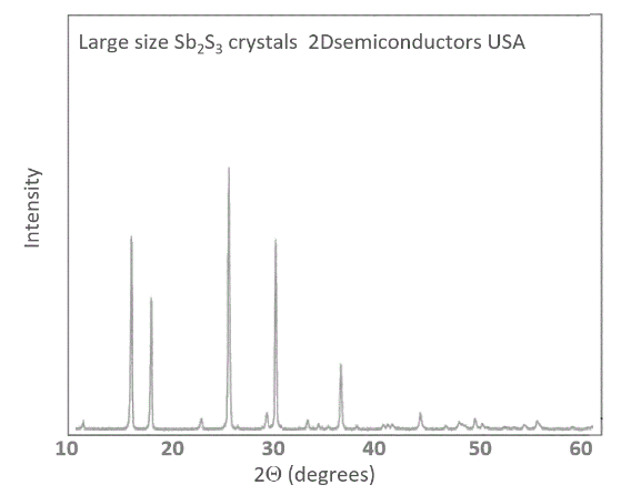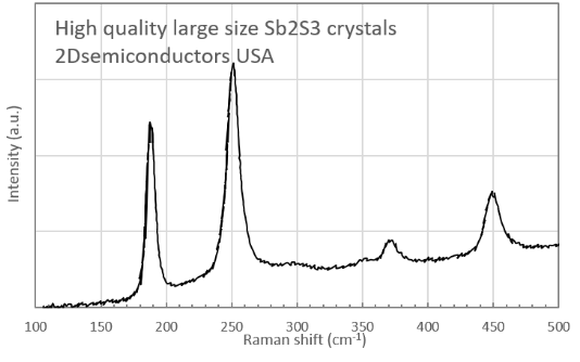Sb2S3 crystals measure ~0.5 cm or larger in size, rated at 99.9998% purity, and exhibit strong and sharp Raman signal, ideal environmental stability, and high crystalline order. Crystals are synthesized through flux zone technique to high high crystallinity and enable exfoliation.