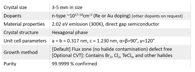 Growth method matters> Flux zone or CVT growth method? Contamination of halides and point defects in layered crystals are well known cause for their reduced electronic mobility, reduced anisotropic response, poor e-h recombination, low-PL emission, and lower optical absorption. Flux zone technique is a halide free technique used for synthesizing truly semiconductor grade vdW crystals. This method distinguishes itself from chemical vapor transport (CVT) technique in the following regard: CVT is a quick (~2 weeks) growth method but exhibits poor crystalline quality and the defect concentration reaches to 1E11 to 1E12 cm-2 range. In contrast, flux method takes long (~3 months) growth time, but ensures slow crystallization for perfect atomic structuring, and impurity free crystal growth with defect concentration as low as 1E9 - 1E10 cm-2. During check out just state which type of growth process is preferred. Unless otherwise stated, 2Dsemiconductors ships Flux zone crystals as a default choice.