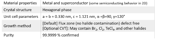 100% environmentally stable metallic NbS2 (niobium disulfide) crystals: NbS2 displays metallic and superconducting behavior. Undergoes superconducting transition at low temperatures and exhibits CDW behavior. Our NbS2 crystals are grown by two distinct methods as summarized below (CVT vs flux zone). Clean and defect free crystal growth enabled us to create the only commercially available NbS2 vdW crystals with guaranteed CDW and superconducting responses.