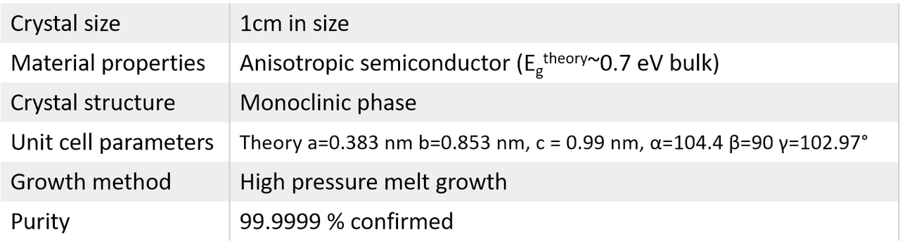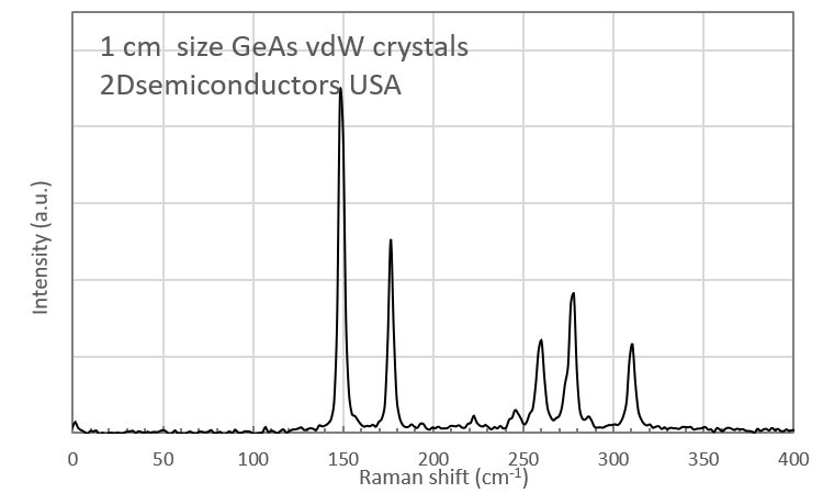 Our single crystal GeAs (Germanium arsenide) crystals come with guaranteed anisotropy, electronic, and optical grade crystal quality. They are developed at our facilities using state-of-art flux zone techniques. Each growth takes close to three months to provide you perfected crystals that does not contain any halides. In contrast to commonly used chemical vapor transport (CVT) technique, flux grown crystals are well known for their structural perfection and electronic/optical performance. Each crystal very large in size to last for years, is highly crystalline, oriented in 0001 direction, and easy to exfoliate. Our R&D staff takes characterization dataset in each sample piece to ensure structural, optical, and electronic consistency. Please also see our GeS, GeSe, GeTe, GeAs, GeP, and Ge-based solutions.