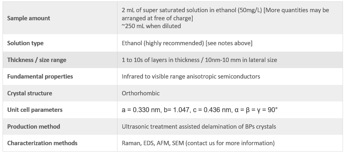 This product contains black phosphorus (BPs) mono- and few-layer flakes solution in ethanol. The BPs solution has been developed by ultrasonic treatment of BPs high quality crystals synthesized through cubic anvil device high pressure growth technique. Since the starting material BPs is highly crystalline, ultrasonic treatment to delaminate BPs layers yields highly crystalline BPs mono-, few-, and some thick layers suspended in ethanol solution. The crystallinity of BPs nanomaterials has been confirmed through electron energy dispersive spectroscopy (EDAX), Raman spectroscopy (FWHM<5 cm-1), and scanning electron microscopy (SEM) measurements. Lateral sizes of BPs flakes deposited onto different substrates range from ~25nm - ~10 mm while thickness range from 1L to 10s of layers.