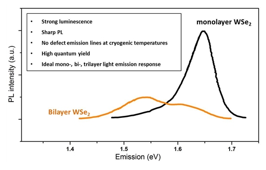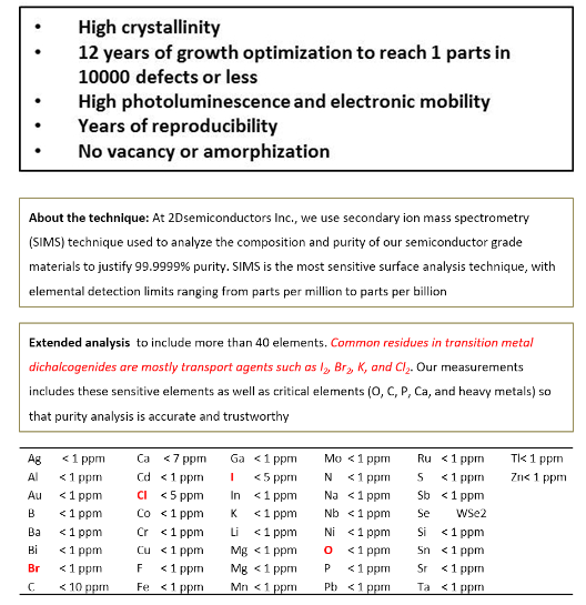 14 years of growth optimization lead to our flawless WSe2 crystals: Our large size vdW WSe2 crystals are treated as gold standards in 2D materials field. WSe2 crystals from 2Dsemiconductors are known for its superior valleytronic performance, perfect crystallization, defect free structure, extremely narrow PL bandwidths, clean PL spectra (free of bound exciton shoulders), and high carrier mobility. Thousands of scientific articles have cited us and used these crystals for scientific accuracy and clean signals. Please also see our n- and p-type WSe2 crystals doped with Au, Re, Nb, or other transition metal atoms.