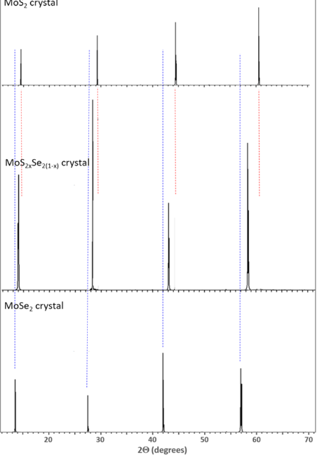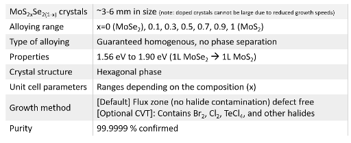 Our MoSSe alloys with the chemical formula MoS2xSe2(1-x) crystals perfectly crystallize in 2H phase and come at different alloy ratios x. Our crystals are grown using two different techniques through chemical vapor transport (CVT) or flux zone growth (see description of these two methods below) and their composition values were determined by XPS, SAED, and EDS measurements.. These crystals all possess extremely narrow PL bandwidths, display clean PL spectra, high carrier mobility, extremely clean and sharp XRD peaks, and negligible amount of defects (see published results as well as CVT vs. Flux based methods below ). These crystals come with guaranteed alloying and valleytronic response, sharp PL, and good electronic response.