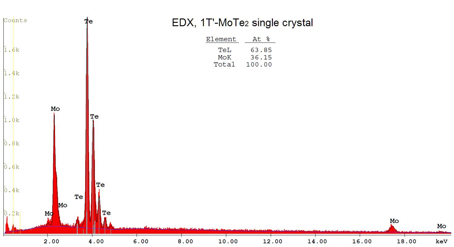 Stoichiometric analysis of a single crystal 1T'-MoTe2 by Energy-dispersive X-ray spectroscopy (EDX).