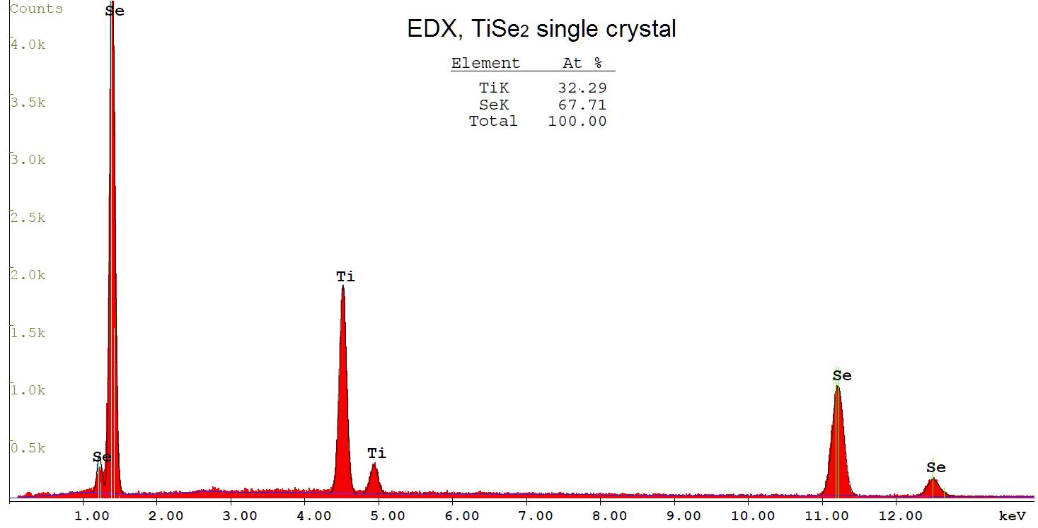Stoichiometric analysis of a single crystal TiSe2 by Energy-dispersive X-ray spectroscopy (EDX).