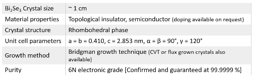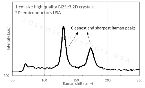 Bismuth Selenide (Bi?Se?) Developed at our facilities since early 2011 to optimize the perfect stoichiometry and stabilize the topological insulator state.Topological insulator is a new class of material, in which its bulk is insulating while its surface states are conducting. The surface states of topological insulator are robust against any external perturbation because such states are protected by time-reversal symmetry. Similar to transition metal dichalgonides and graphite, Bi?Se? is also layered material with weak interlayer coupling. Our crystals are develop in our laboratories in last two years and are highly crystalline. Raman spectrum displays very sharp and clear modes with FWHM less than 4cm-1. If your research needs doping in Bi2Se3, we can also incorporate Ca, Nb, Ni, and Au dopants in Bi2Se3 crystals. Please also see our doped p-type and n-type Bi2Se3 crystals.