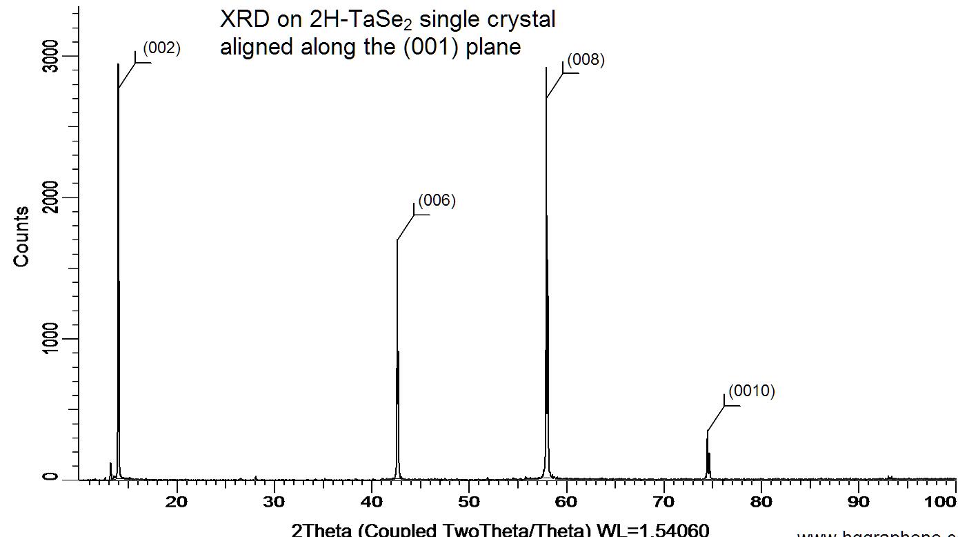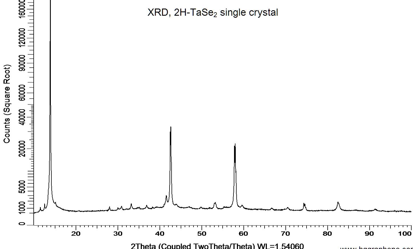 Powder X-ray diffraction (XRD) of a single crystal 2H-TaSe2. X-ray diffraction was performed at room temperature using a D8 Venture Bruker.